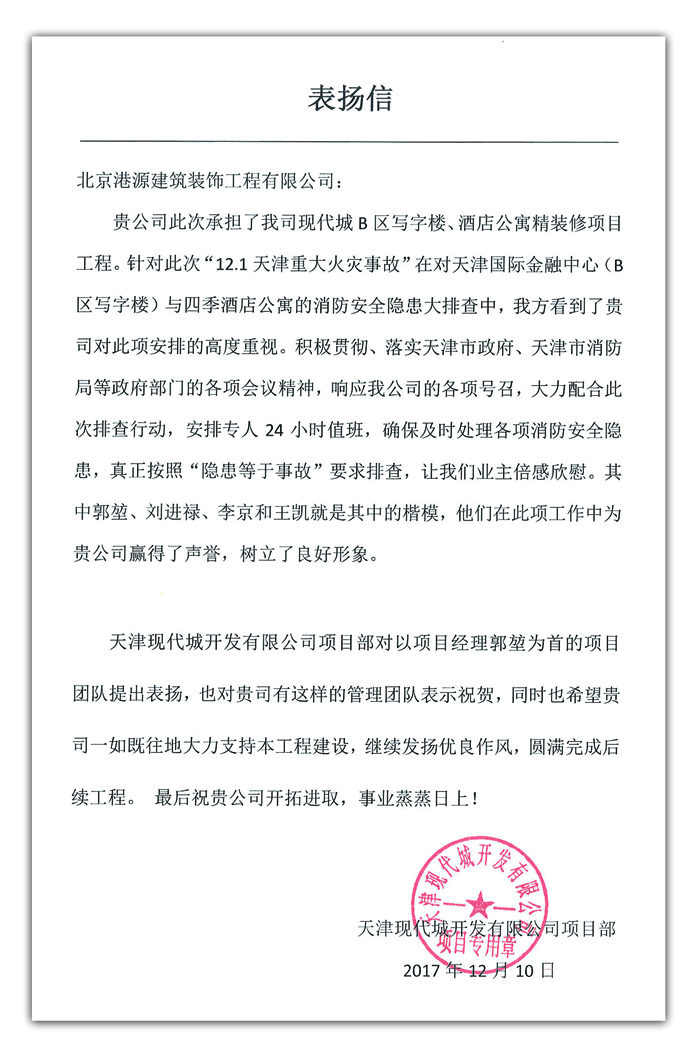 2017年12月15日,我公司收到天津現代城項目業(yè)主的《表?yè)P信》,向港源裝飾第五分公司在天津現代城項目中安全管理工作提出表彰!