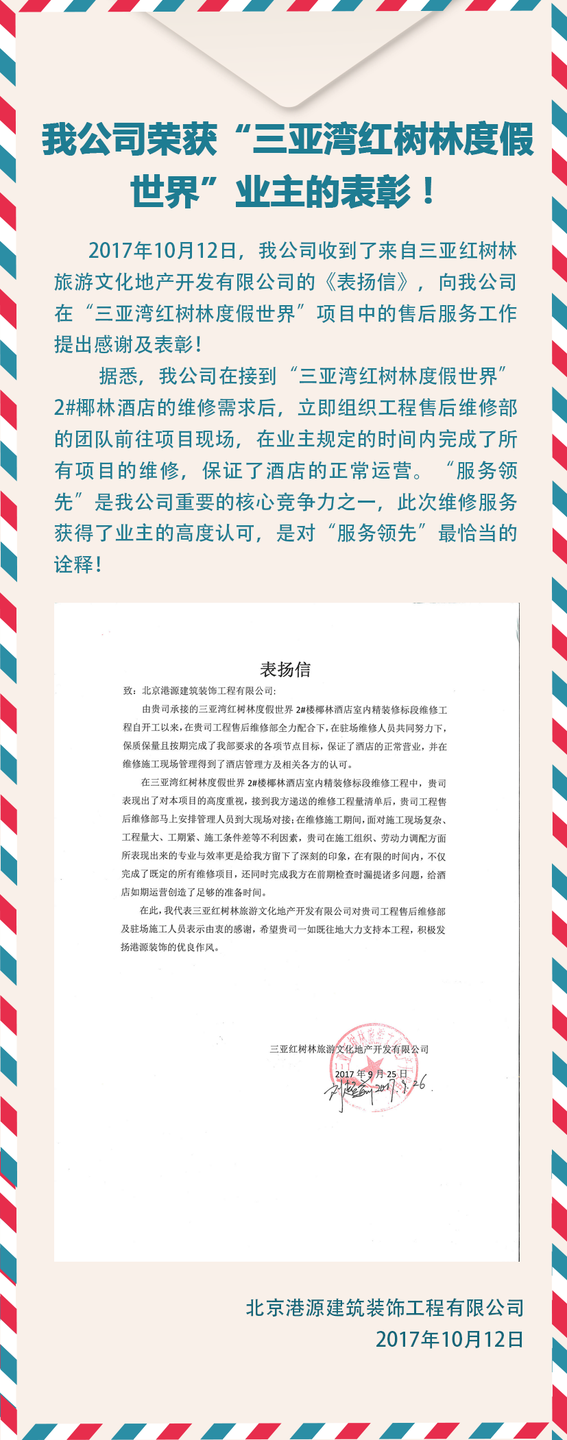 我公司榮獲“三亞灣紅樹(shù)林度假世界”業(yè)主的表彰!