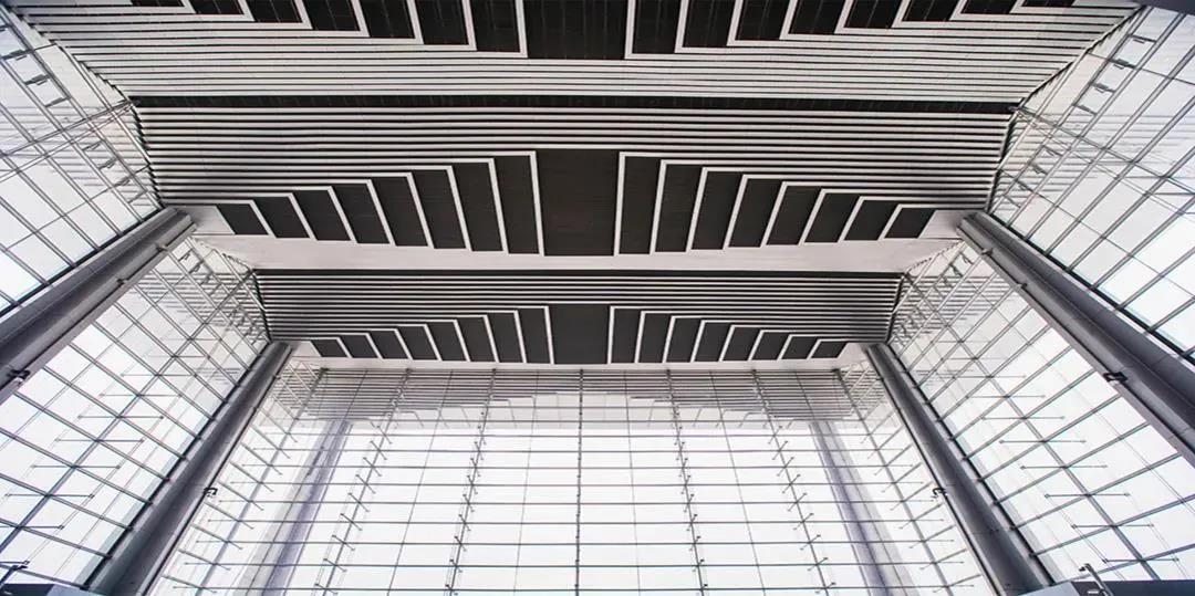 在建設會(huì )展中心期間,港源裝飾面臨的最大挑戰是這座建筑的登錄大廳。登錄大廳是會(huì )展中心展覽館的入口大廳,挑高38米,16根相互獨立的十字巨柱呈現了大廳高聳宏偉的氣魄;大廳屋蓋為“大跨度+漸變多邊形截面并聯(lián)式空間鋼桁架”結構,距離地面38米。該區域的施工難度大、精度要求高、交叉作業(yè)復雜,項目團隊要在有限的工期內同時(shí)保證施工精度和施工安全,是團隊在管理協(xié)調、技藝經(jīng)驗等綜合能力的一大考驗。