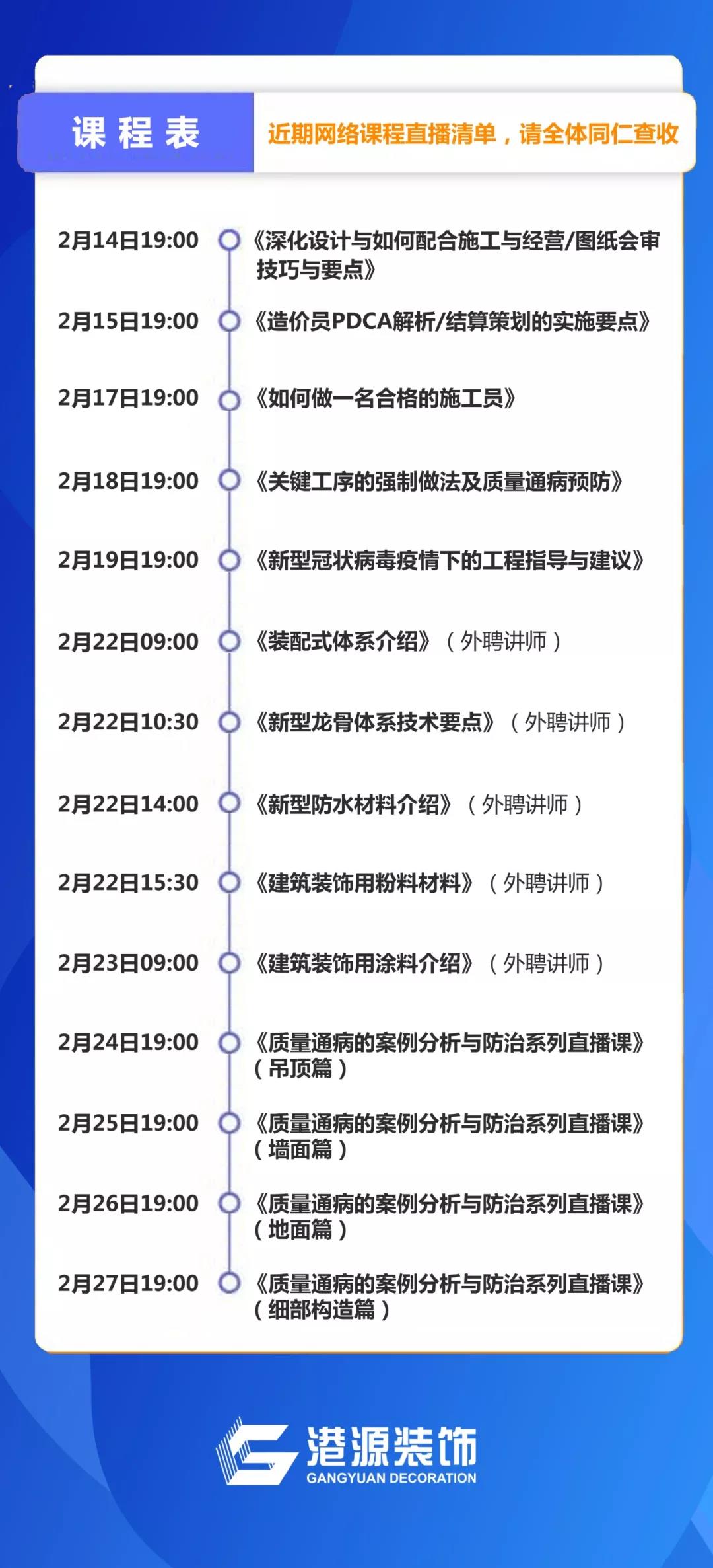 抗疫時(shí)期,恰是自我提升的黃金階段。為了減少大范圍人員聚集的同時(shí)又能達到集體培訓的互動(dòng)效果,港源裝飾近期將線(xiàn)下培訓改為網(wǎng)課直播,每天晚上邀請一位講師通過(guò)視頻與員工“面對面”傳授經(jīng)驗、答疑解惑,為員工提供提升自我、交流分享的平臺。