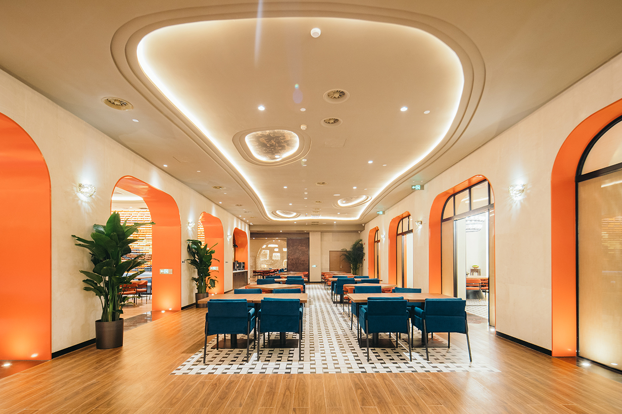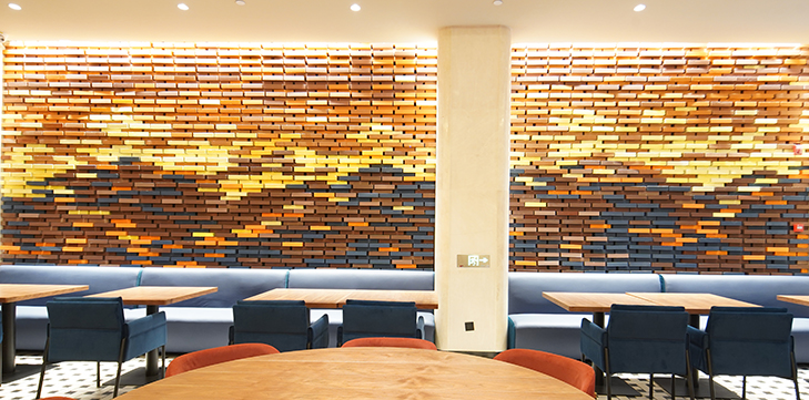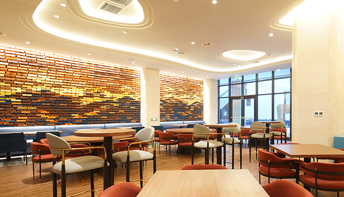 酒店國際餐廳區域的藝術(shù)墻體由千余塊紅磚壘砌,以凹凸不一的磚塊拼接形式,呈現了一幅特別的風(fēng)景畫(huà)卷。為實(shí)現設計預期,港源裝飾項目團隊對每一塊紅磚進(jìn)行開(kāi)槽加固,壘砌時(shí)精密地留出不規則縫隙,確保凹凸尺度能夠高度還原墻體藝術(shù)效果。此外,港源裝飾項目團隊還充分考慮了墻體對實(shí)心紅磚的承重能力以,反復對墻板進(jìn)行加固處理,保證了餐廳墻體的堅固、安全。