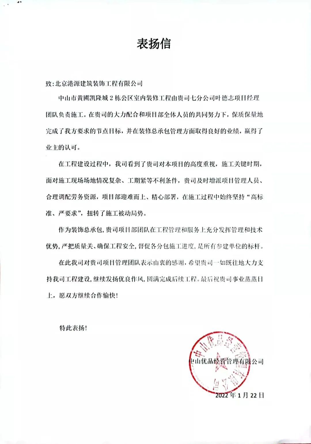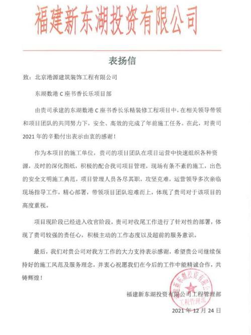 一封封表?yè)P信、感謝信,是對港源品牌的認可,也是對全體項目管理人員付出的肯定,更是鞭策我們不斷提高服務(wù)質(zhì)量的動(dòng)力。在今后的施工管理服務(wù)中,北京港源將堅持以“讓客戶(hù)更滿(mǎn)意”為宗旨,以適應客戶(hù)的多樣化需求。