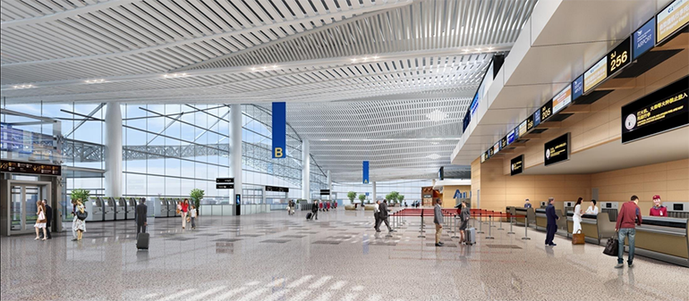 港源裝飾在本項目中負責航站樓一層行李提取大廳、遠機位候機廳、行李提取廳、貴賓室及二層候機廳、商業(yè)區等功能區域的精裝修工程。