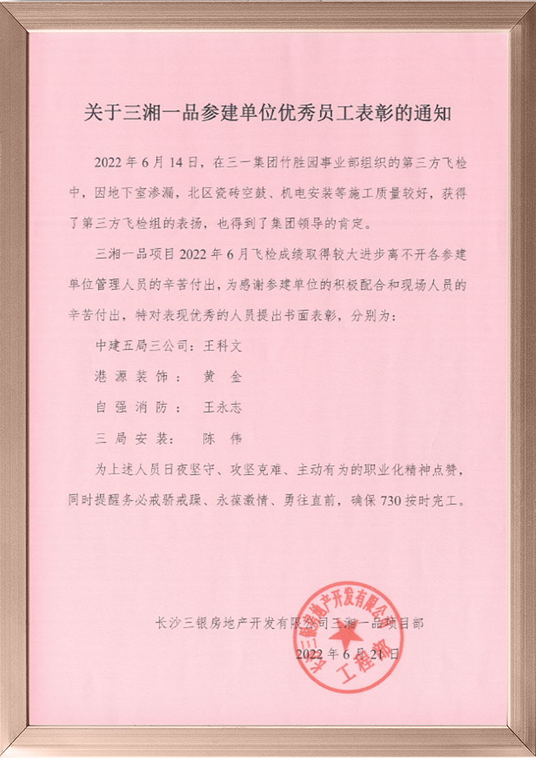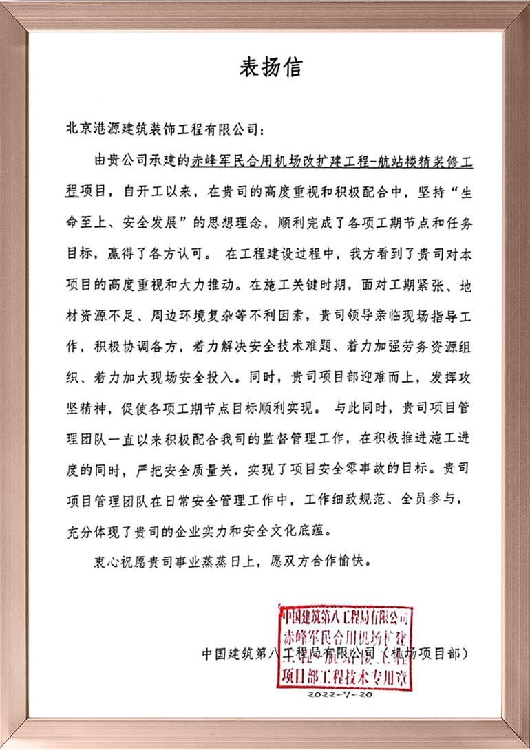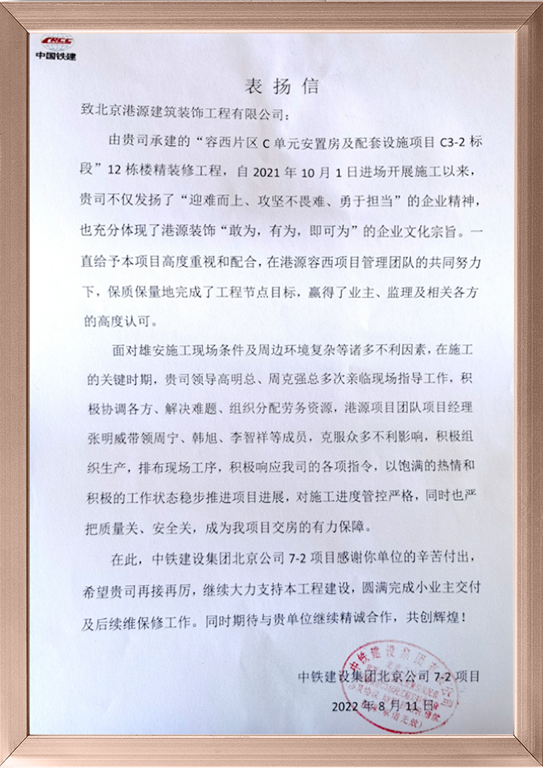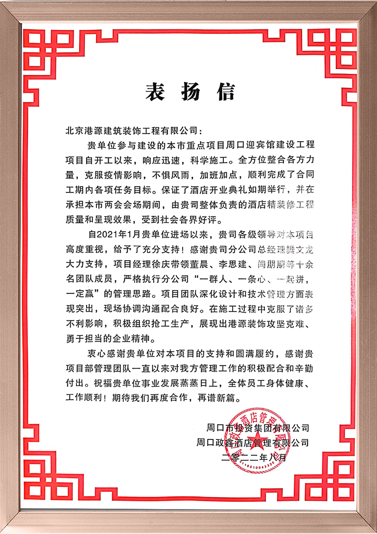 2022上半年,港源裝飾歷經(jīng)重重考驗,一以貫之地發(fā)揚契約精神及頑強奮戰的鐵軍作風(fēng),始終堅持“讓客戶(hù)更滿(mǎn)意”的企業(yè)宗旨,奮力完成了各項既定目標。一封封表?yè)P信,承載著(zhù)業(yè)主的支持和贊譽(yù),也是對港源裝飾誠信履約的最好詮釋。