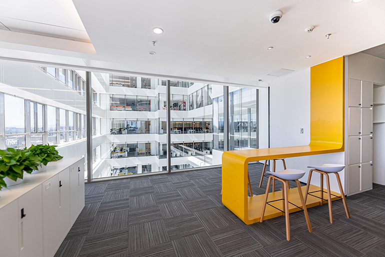 港源裝飾項目團隊深刻理解裝修材質(zhì)及色彩把控對空間塑造的重要性,在施工過(guò)程中靈活運用漸進(jìn)色、反差跳色,在以尚白為基礎色調的辦公區域,通過(guò)背漆玻璃的青白、木飾面固裝和無(wú)機涂料的乳白、鋼板天花的啞光白、鋁板飾面的雪白、瓷磚的米白,在簡(jiǎn)約中和諧地創(chuàng )造了豐盈的立體視覺(jué)享受,規避了呆板單一的視覺(jué)效果,創(chuàng )造了一個(gè)層次遞進(jìn)的白色美學(xué)空間。